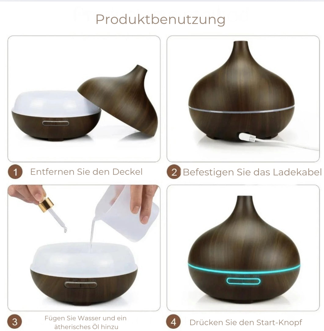 5-in-1 Aromadiffuser: Dieser vielseitige Diffuser kombiniert Aromatherapie, Luftbefeuchter, Nachtlicht, Dekoration und mehr. Er schafft eine angenehme Atmosphäre, hebt die Stimmung und sorgt für Entspannung.