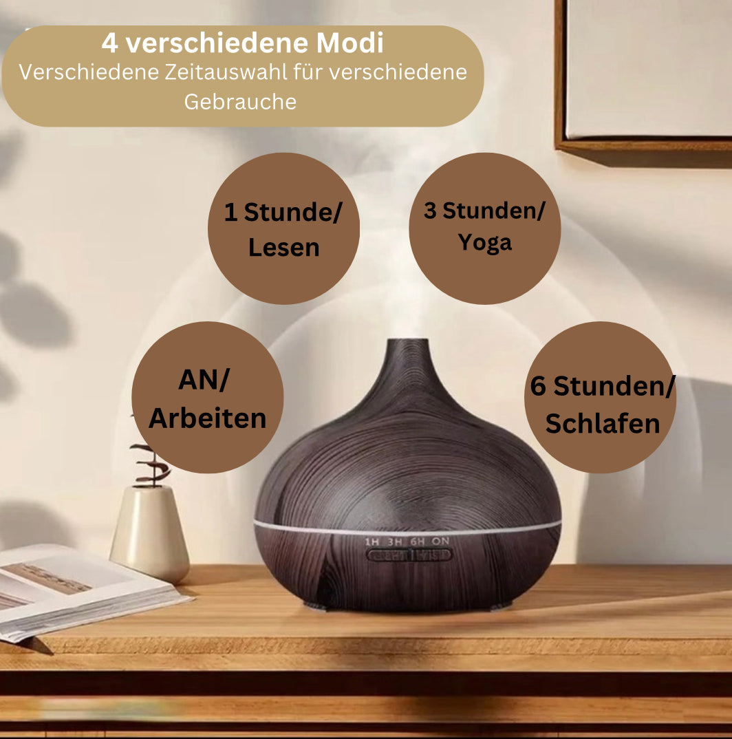 Elegantes Design: Der Diffuser im Holz-Look fügt sich harmonisch in jedes Zuhause ein. Hergestellt aus BPA-freiem Material, sorgt er für eine ruhige und stilvolle Atmosphäre.